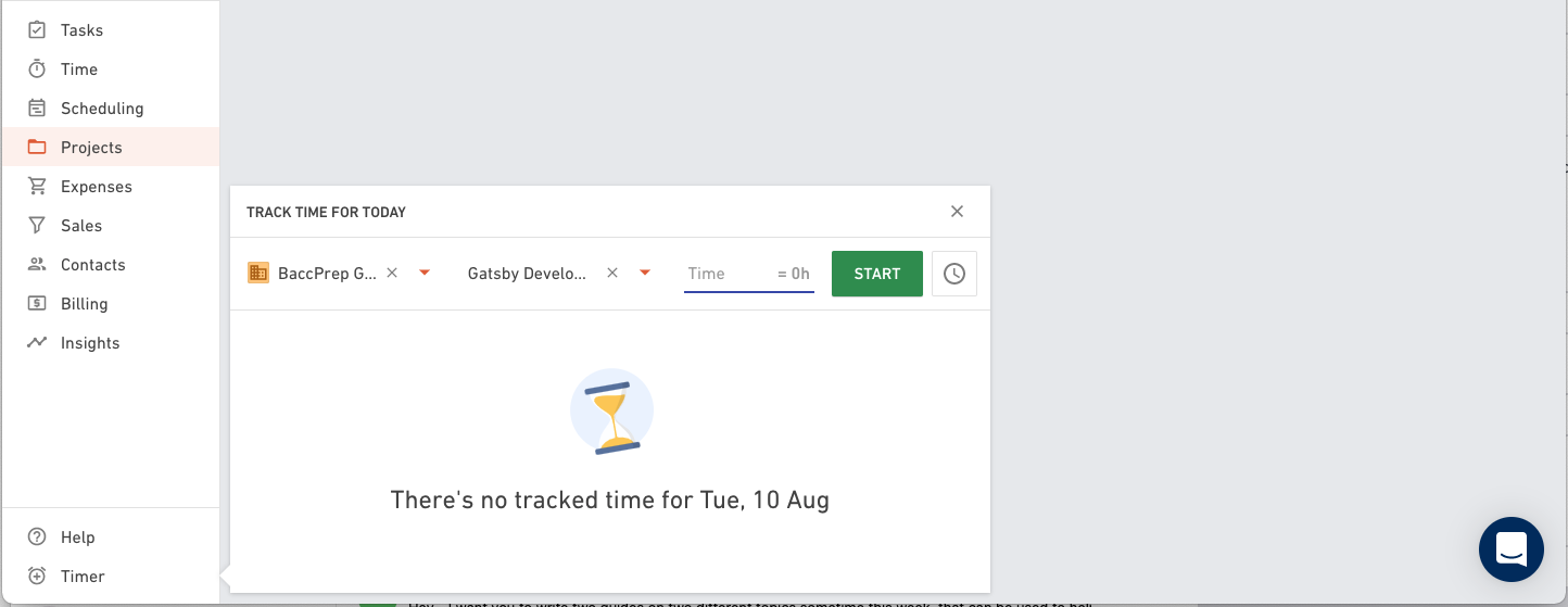 In order to track your hours, you simply open up the timer in the bottom left hand corner, select the project you're working on (if there is no project for the task you're working on, choose Dev Logins as the project) and the task you're doing (usually Gatsby Development), and then click Start. The below shows an example of this.